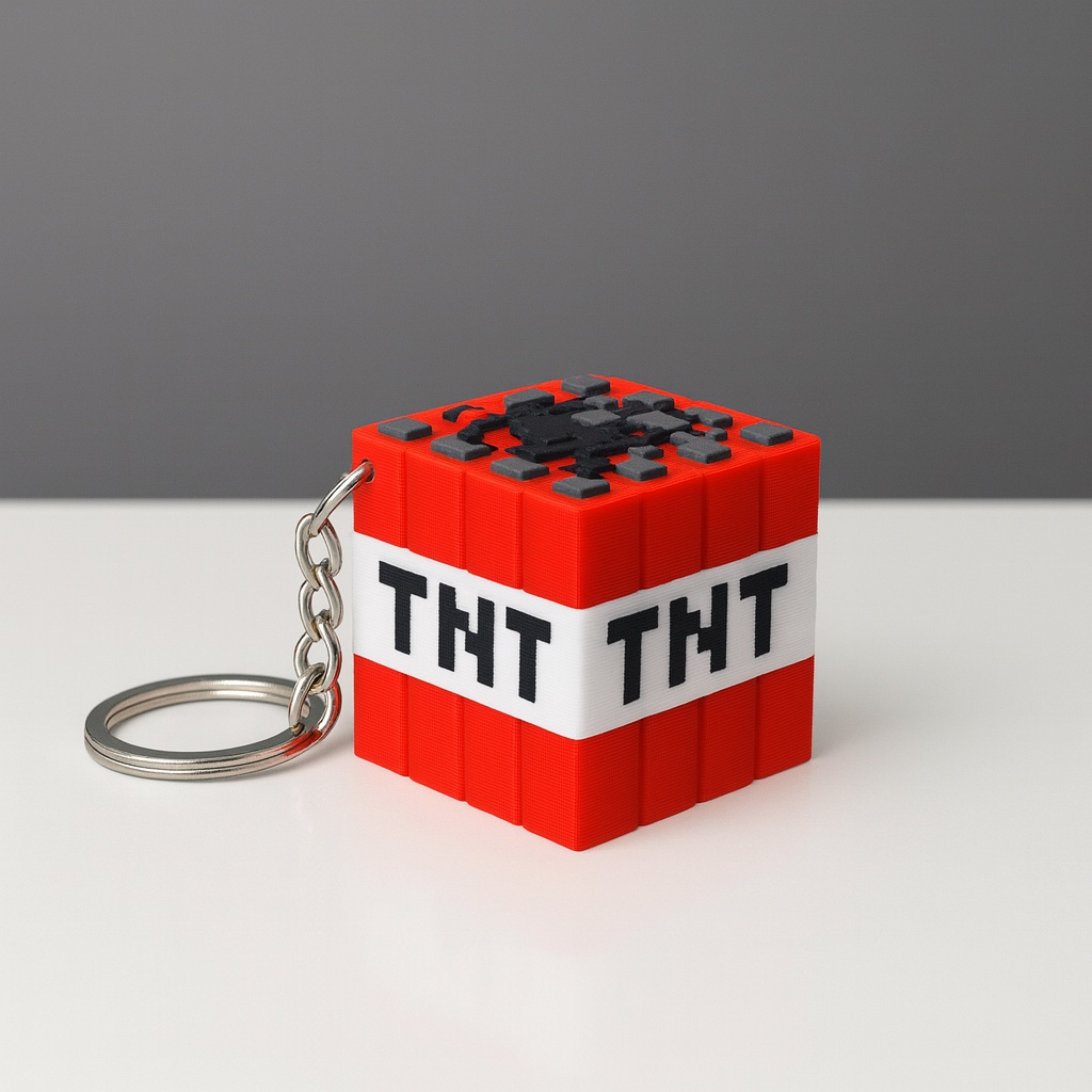Minecraft dünyasının en ikonik ve patlayıcı unsuru olan TNT blok, şimdi 3D baskı teknolojisi ile hayat buldu. Bu özel tasarım anahtarlık, PLA malzeme ile üretilmiştir ve gerçek oyundaki blok görünümüne sadık kalınarak tasarlanmıştır.